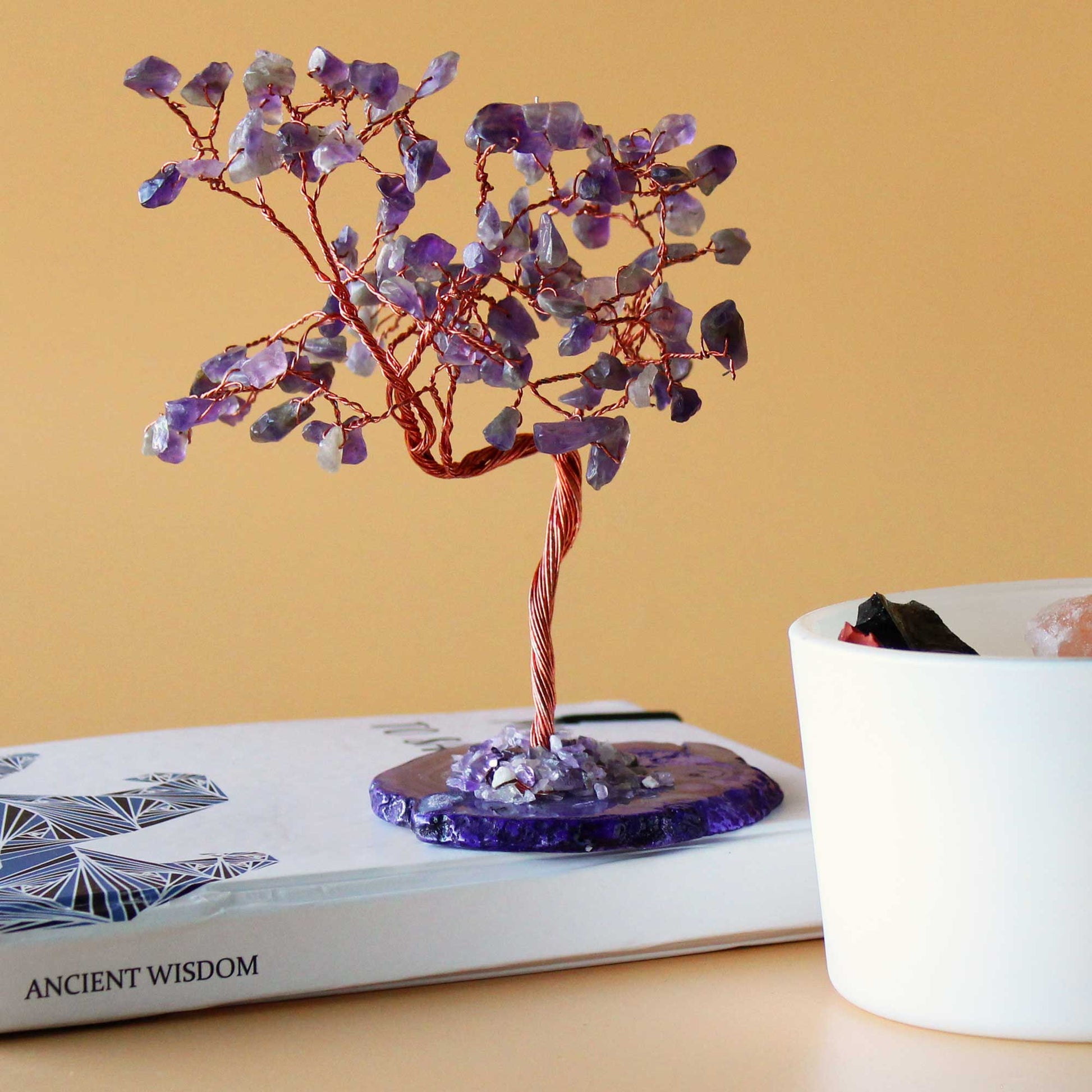 Amethist staat bekend als steen van innerlijke rust, helderheid en spirituele groei. In deze boom vormen de kristallen een fonkelende kroon van kalmte en bescherming, terwijl de natuurlijke agaat een aardende tegenhanger biedt. Samen creëren ze een stuk dat niet alleen decoratief is, maar ook een bron van energetische harmonie in elke ruimte.